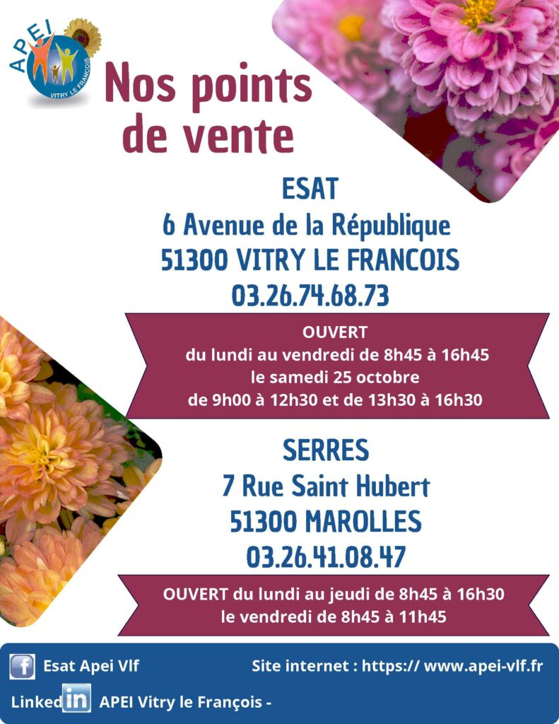 Octobre est là avec ses plantes automnales. Venez les retrouver sur le stand de l’ESAT au 6 avenue de la république à Vitry mais également aux Serres de Marolles situées au 7 rue Saint Hubert