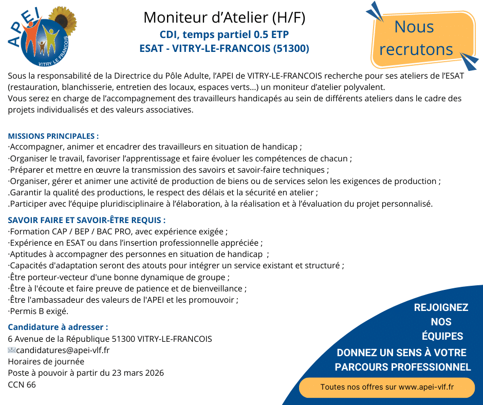 L’APEI de VITRY LE FRANCOIS recrute